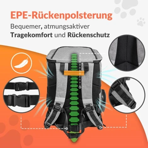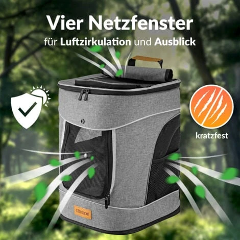 Dans les 2 poches latérales munies d’un maillage en caoutchouc robuste, vous pouvez pratiquement ranger des bouteilles ou des aliments. Les 3 fenêtres de maille garantissent une bonne circulation de l’air – votre animal peut bien observer son entourage.