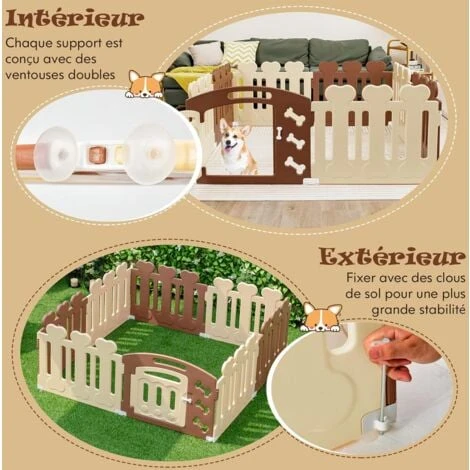 - 【Idéal pour intérieur et extérieur :】Chaque support avec des ventouses doubles rend l’enclos de chien attaché aux sols intérieurs. Vous pouvez également fixer avec des clous au sol pour la stabilité lors de l’utilisation du parc à l’extérieur.