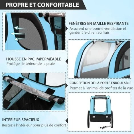 - Équipée d’une tête d’attelage universelle, la remorque pour animaux de compagnie convient à la plupart des vélos