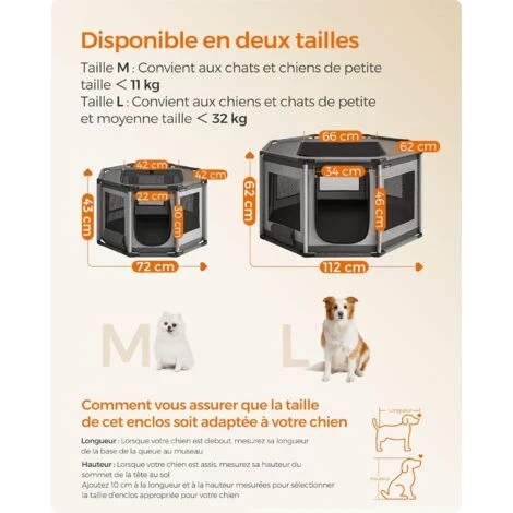 [Large espace] Ce chenil de 112 x 112 x 62 cm convient aux chats et chiens de petite et moyenne taille jusqu’à 32 kg comme le Springer Spaniel, le Bull Terrier, le Chow Chow, le Shetland, le Beagle, le Shiba Inu… Choisissez selon votre animal