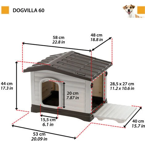 Niche pour l’extérieur en résine thermoplastique, matéraux résistant aux chocs et aux rayons UV. Dotée de parois latérales qui s’ouvrent et qui se tranforment en une plate-forme apportant plus d’espace à votre animal de compagnie. Base avec système de drainage des liquides. La niche est équipée d’une grille de ventilation intérieur pour assurer une bonne ventilation et un environnement toujours sec pour le chien. Grâce à la conception, Dogvilla se monte rapidement sans l’utilisation d’outils spéciaux. Entretien facile grâce au toit amovible. Accessoires recommandés : coussin technique Jolly, porte en plastique atoxique, kit de panneau d’isolation. Modèle conseillé pour un chien de petite taille. Dimensions complètes: L 58 x W 48 x H 44 cm. Dimensions intérieures : L 47,5 x W 35,5 x H 36 cm. Dimensions de la porte : 16 x 20,5 cm.