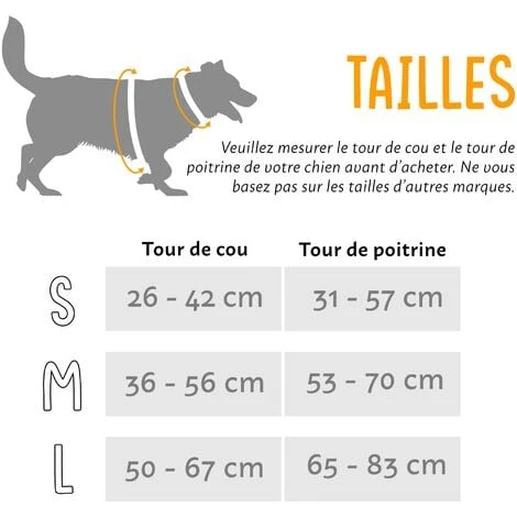 ✅ ADAPTÉ À TOUS LES CHIENS : ce harnais anti-traction comporte quatre points de réglage ainsi que des élastiques au niveau du ventre pour plus de souplesse. La taille S convient à un animal avec un tour de cou de 26-42 cm et un tour de poitrine de 31-57 cm. La taille M convient à un animal avec un tour de cou de 36-56 cm et un tour de poitrine de 53-70 cm. La taille L convient à un gros animal avec un tour de cou de 50-67 cm et un tour de poitrine de 65-83 cm.