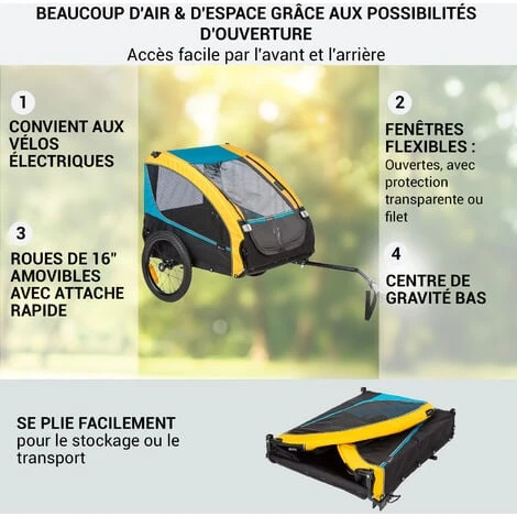 PROTÉGEZ VOTRE ANIMAL DE COMPAGNIE : Cette remorque velo chien est idĂ©ale pour emmener votre chien partout avec vous. FabriquĂ©e avec une toile Oxford 600D, la remorque est dotĂ©e d’un plancher en plastique antidĂ©rapant, hydrofuge et facile Ă nettoyer.