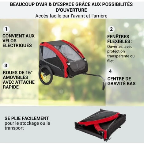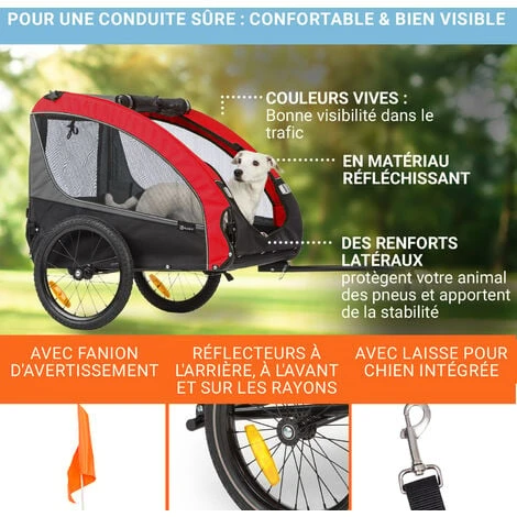 TOUJOURS EN SÉCURITÉ : Gardez votre chien heureux et en sécurité avec une laisse de sécurité préinstallée, des moustiquaire avant et arrière pour de l’air frais, un drapeau d’avertissement et des réflecteurs avant, arrière et sur les rayons de roues.