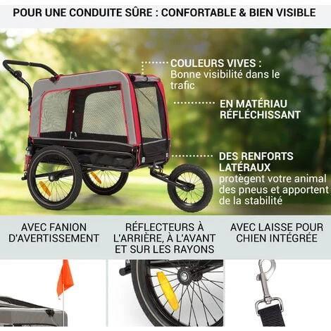 TOUJOURS EN SÉCURITÉ : Gardez votre chien heureux et en sécurité avec une laisse de sécurité préinstallée, des moustiquaire avant et arrière pour de l’air frais, un drapeau d’avertissement et des réflecteurs avant, arrière et sur les rayons de roues.