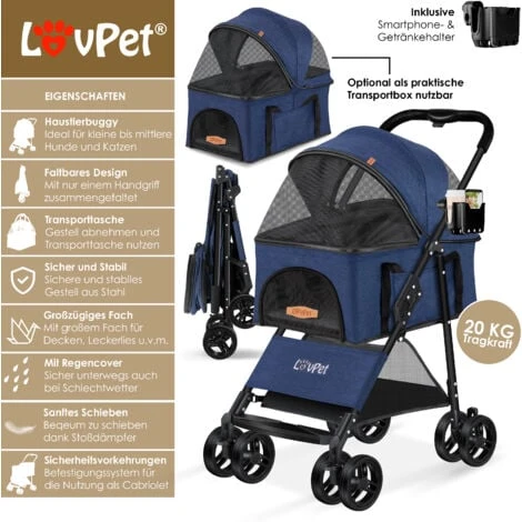La poussette pour chien LOVPET se pousse facilement grâce à un amortisseur, idéal pour les chiens et chats de petite et moyenne taille, se plie en un tour de main, châssis sûr et stable en acier, accessoires comme un grand compartiment pour les friandises et les couvertures ainsi qu’une housse de pluie en cas de mauvais temps