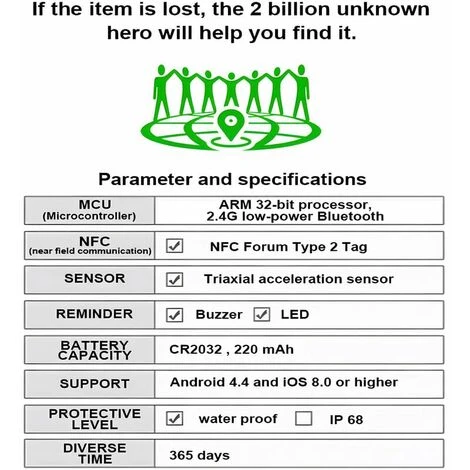 Rappel méthode : Retour à la zone de sonnerie, LED Capacité de la batterie : CR2032, 220 mAh Plate-forme prise en charge : Android 44 et I0S 8.0 et supérieur Classe de protection : Étanche Autonomie de la batterie : 365 jours >