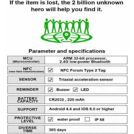 Rappel méthode : Retour à la zone de sonnerie, LED Capacité de la batterie : CR2032, 220 mAh Plate-forme prise en charge : Android 44 et I0S 8.0 et supérieur Classe de protection : Étanche Autonomie de la batterie : 365 jours >