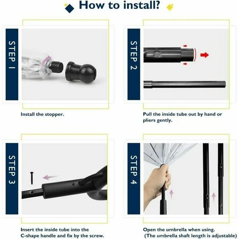 2.Tirez le parapluie pour chien et collez-le dans la poignée du parapluie en forme de C fixée avec la vis