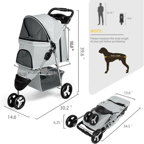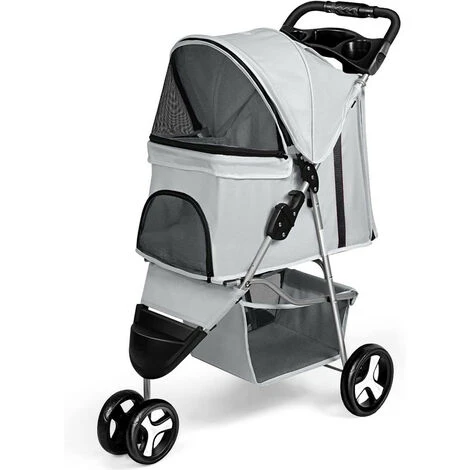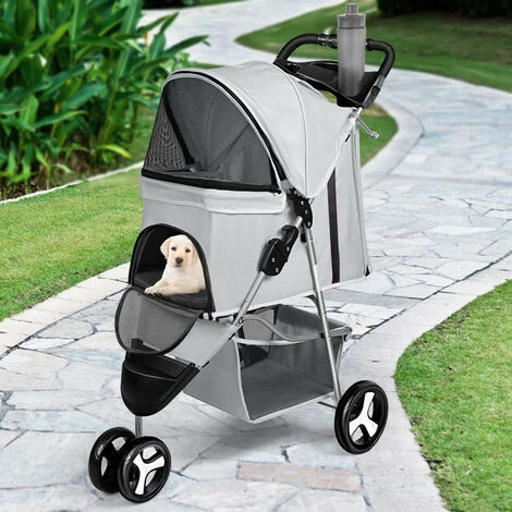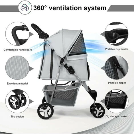 Poussette buggy pour chien pliable à 3 roues idéale pour les animaux de compagnie, les chiens et les chats âgés, infirmes, de petite et moyenne taille ; C’est idéal pour faire du shopping, marcher, camper et voyager avec votre animal de compagnie bien-aimé.