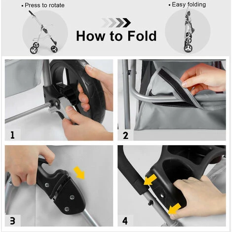 Cette poussette pour animal de compagnie est équipée d’une fonction de pliage à un bouton.La poussette peut être pliée rapidement et facilement rangée n’importe où, que ce soit à la maison ou en vacances. Aucun obstacle sur le chemin, que ce soit sur l’herbe, le sable ou les routes boueuses
