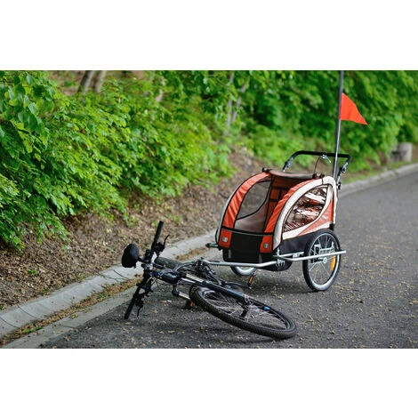 Une remorque à vélo multifonctionnelle à 2 places dans une belle couleur rouge, la remorque à vélo peut être utilisée comme poussette – landau et comme remorque à vélo. La remorque à vélo dispose d’un espace de rangement fonctionnel à l’arrière pour les petits objets et peut être facilement pliée. La remorque à vélo est équipée d’amortisseurs au niveau des roues, ce qui la rend très confortable et peut être pliée sans outils grâce au système de goupille pratique.